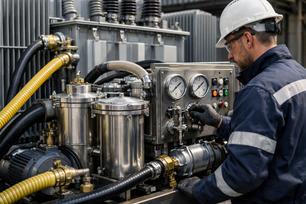 Supply and operation of oil treatment plant for transformer oil filtration, circulation, and energization, ensuring optimal performance and reliability.