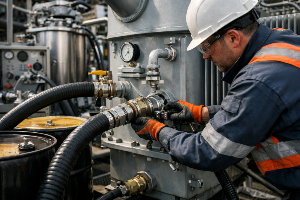 Oil filling, circulation, and calibration of auxiliary systems for transformers ranging from 1000–3000 kVA, followed by safe energization.